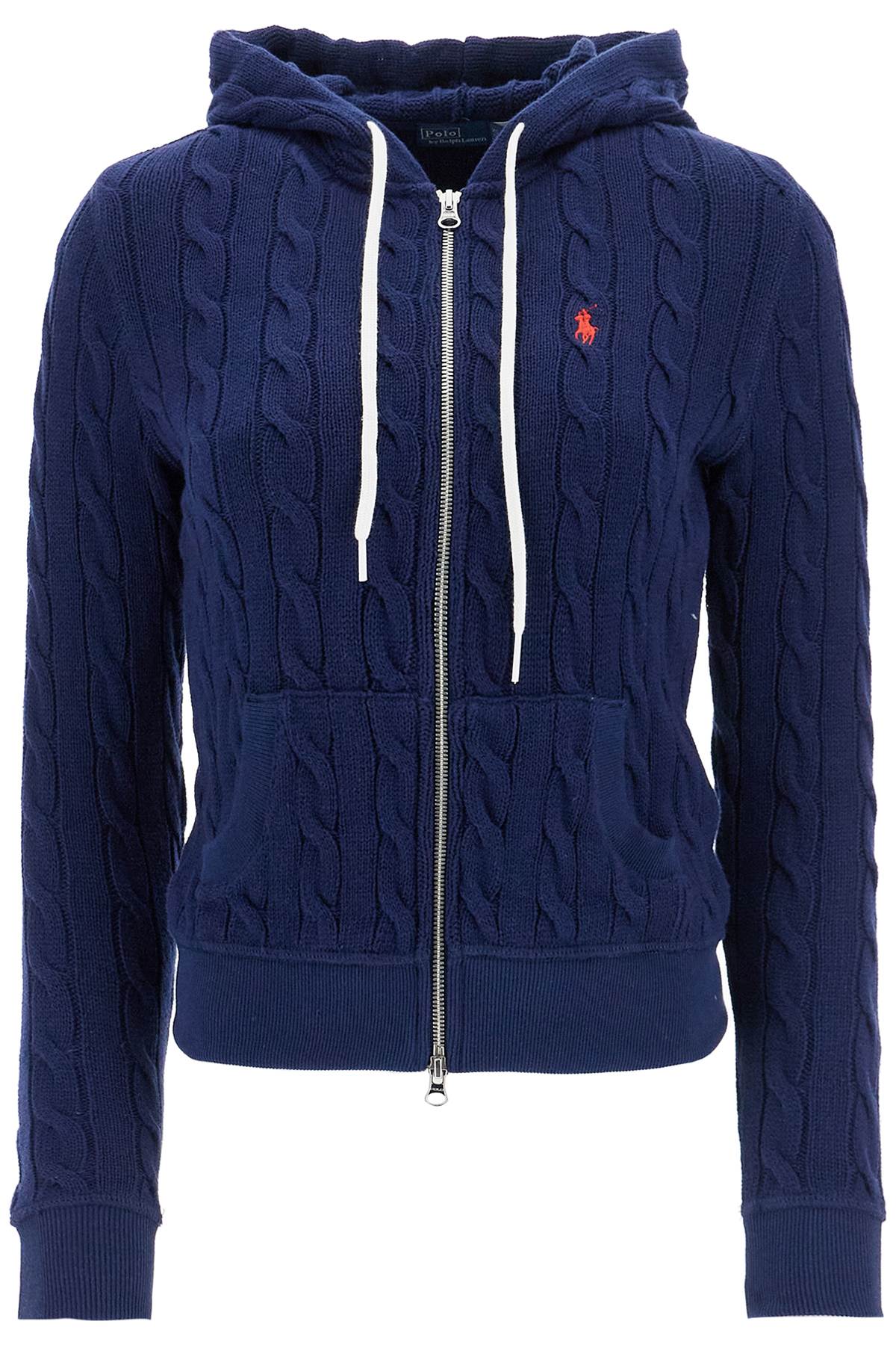 The Polo Ralph Lauren men's cardigan offers timeless elegance. Made from 100% cotton with a hood and zip, it features cable knit and a slim fit. Perfect for any occasion in Newport Navy.